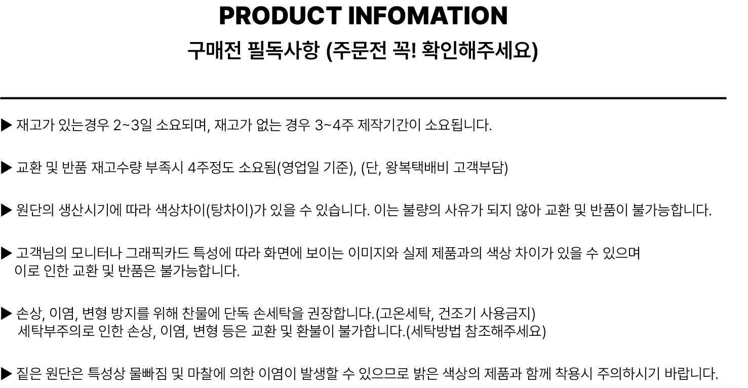 - 주문제작상품(별도 맞춤이나 기성사이즈라도 주문제작된 상품및 치마)은 교환, 반품이 불가합니다.